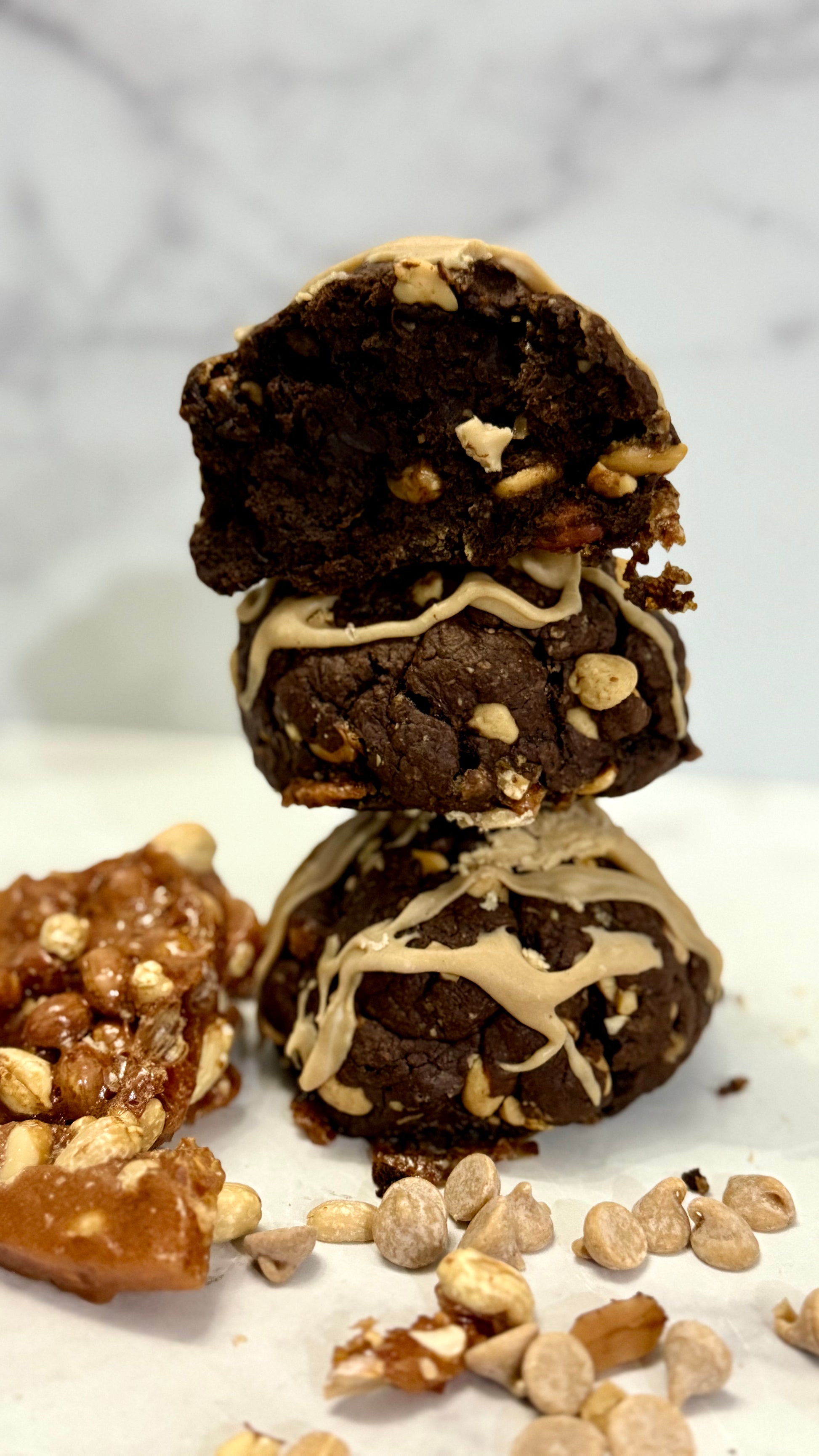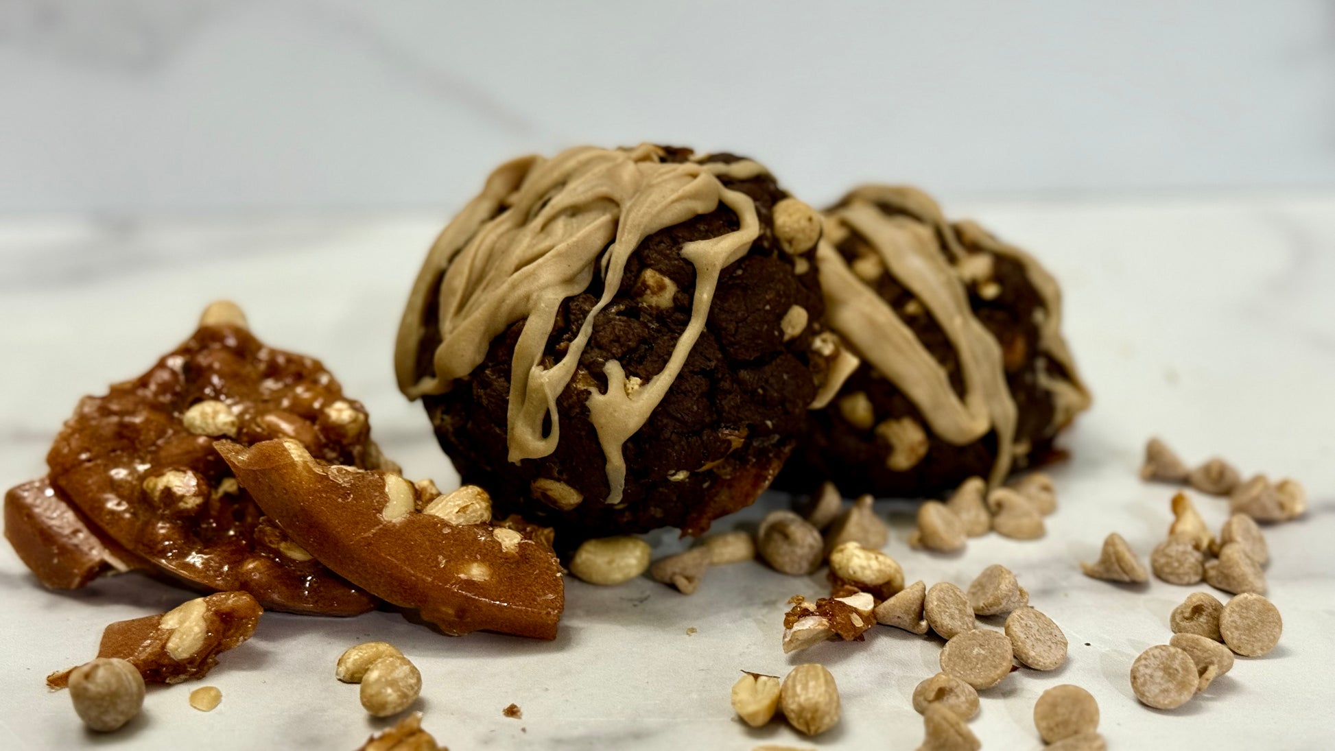 Get ready for a cookie experience like no other with our Peanut Butter Cookie with Peanut Butter Chips, white chocolate chips, peanut brittle and Honey Peanut Butter drizzle!